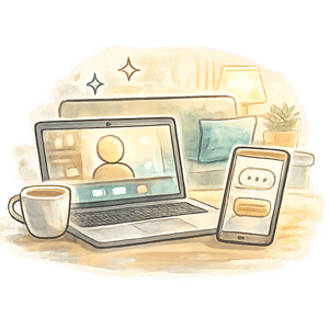 Naše seanse kombinuju profesionalno vođenje i topli, ljudski pristup, sa istom efikasnošću kao terapija licem u lice